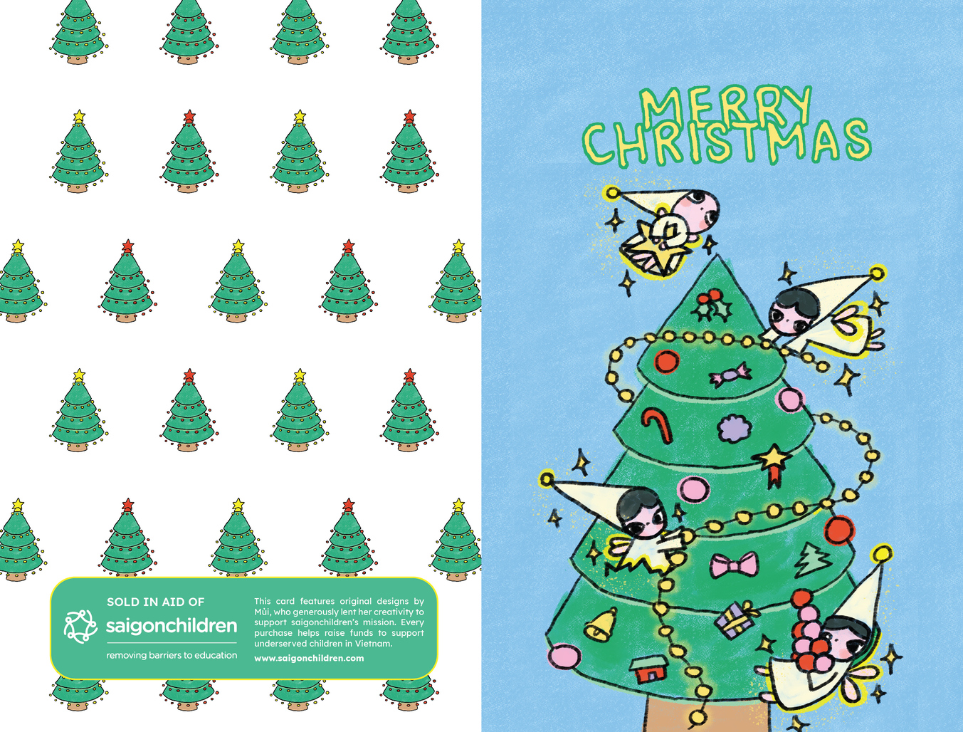 This year’s seasonal cards proudly feature illustrations and designs by Mủi, a young, experienced graphic designer. She shared that she had never taken part in any volunteer work at an NGO before, so when she learned about this annual fundraising project, she immediately agreed to join, wishing to use her skills and creativity to spread positive values.